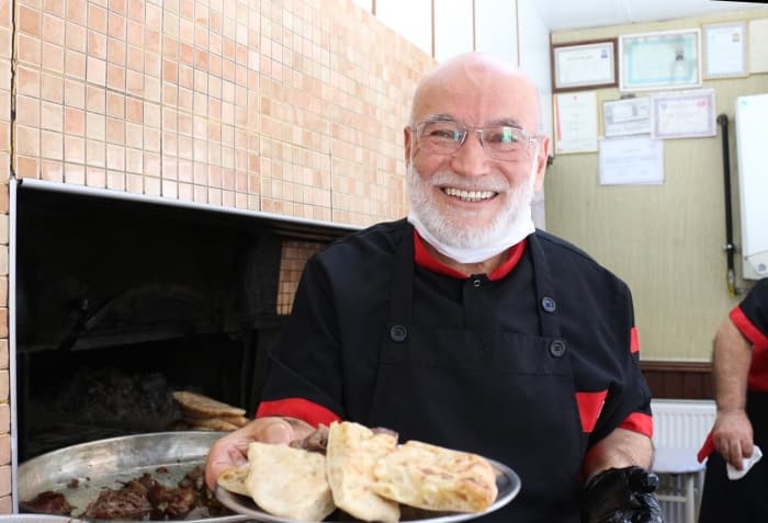 "İşin durumuna göre 50 kilo ile 100 kilo arasında günlük et alırım. Aldıktan sonra kemikleri mutfakta etten ayırıyoruz. Daha sonra yağlı kısımlarını alıp küçük bakır kazanlara koyuyoruz. Etin pişirildiği fırının geleneksel ot tuğlasından yapılmış kara fırın olması gerekiyor. Etleri sabah 5'te pişirmeye başlarız, yaklaşık 5-6 saat meşe odunu ateşinde pişer. Pişince közünde kaynaması gerekir. Kızaran etleri 5-10 dakika arayla içeride çeviririz. Bu da bir kaç saat sürer. Yani kebabın pişmesi 7 saati buluyor. Et tamamen kendi yağıyla pişer. Kazanın içine et dışında sadece iri kaya tuz taneleri girer. Hazırlanan kebap aynı gün içinde tüketilir ve akşam saat 5 gibi biter. Ertesi güne kalmaz."