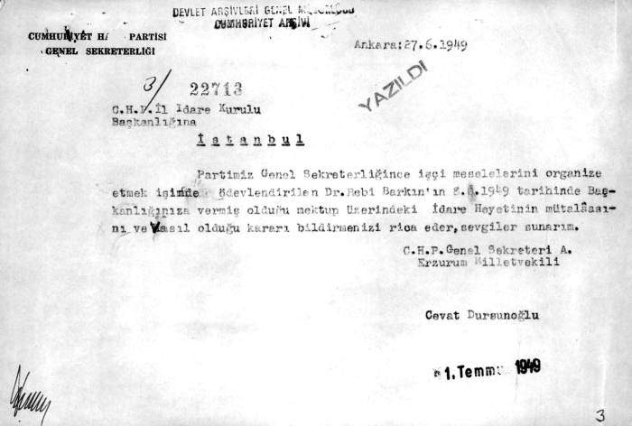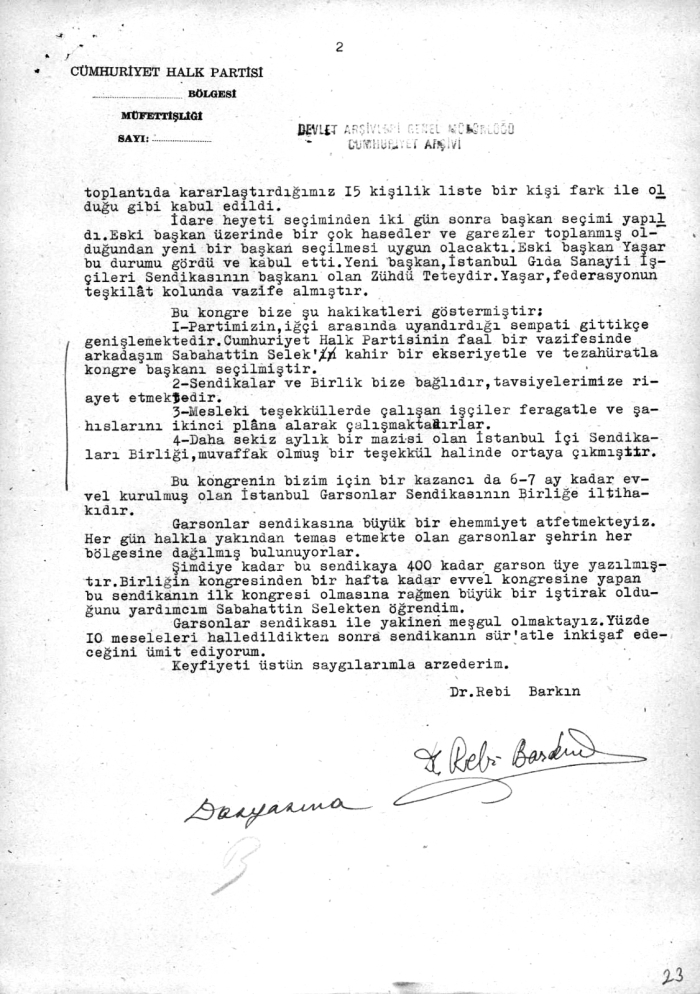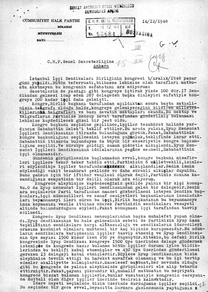 Barkın'ın, CHP Genel Sekreterliğine gönderdiği 14 Aralık 1948 tarihli yazıda İstanbul İşçi Sendikaları Birliği'nin kongresine ilişkin bilgiler yer alıyor. Yazıda, sendikalı bir işçi olmamasına rağmen partili Sabahattin Selek'in (Rebii Barkın'ın yardımcısı) Kongre başkanı olarak seçilmesinden, CHP'li milletvekillerinin alkışlanmasından ve kongrede CHP aleyhine tek bir kişinin konuştuğundan bahsediyor. Sendika seçimlerine ilişkin ise şu ifadeler var: "İdare heyeti seçiminde bizim üzerinde durduğumuz işçiler seçildi. Bu seçimden bir gece evvel, Beyazıt'ta Marmara Gazinosunda yaptığımız toplantıda kararlaştırdığımız 15 kişilik liste bir kişi fark ile olduğu gibi kabul edildi". Seçimlerden bir gün evvel kimlerin yönetime seçileceğine CHP'nin sendikaları örgütlendirmekle görevlendirdiği Rebii Barkın karar verdiğini itiraf ediyor. Aynı yazıda Barkın, "sendikalar ve birlik bize bağlıdır" diyor.