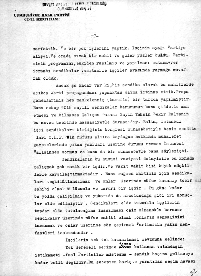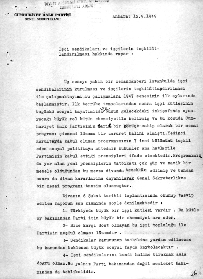 Raporda "üç seneye yakın bir zamandan beri İstanbul'da işçi sendikalarının kurulması ve işçilerin teşkilatlandırılması ile çalışmaktayım. Bu çalışmalara 1947 senesinin ilk aylarında başlanmıştır. İlk tecrübe temaslarından sonra işçi kitlesinin bugünkü sosyal hayatımızda ve bunun gelecekteki inkişafında oynayacağı büyük rol bütün ehemmiyeti ile belirmiş ve bu konuda Cumhuriyet Halk Partisi'nin sarih bir görüşe sahip olarak bir mesai programı çizmesi lüzumu bir zaruret halini almıştı. Divan kararlarına dayanılarak Genel Sekreterlikçe bir mesai programı tanzim olunmuştur." Görüldüğü gibi CHP, 1946 seçimlerinde destek bulamadığı işçileri, kuracağı sendikalar yoluyla partiye müzahir hale getirmek istiyor. Bunu nasıl yapacağına ilişkin hususlara da raporda yer veriyor.