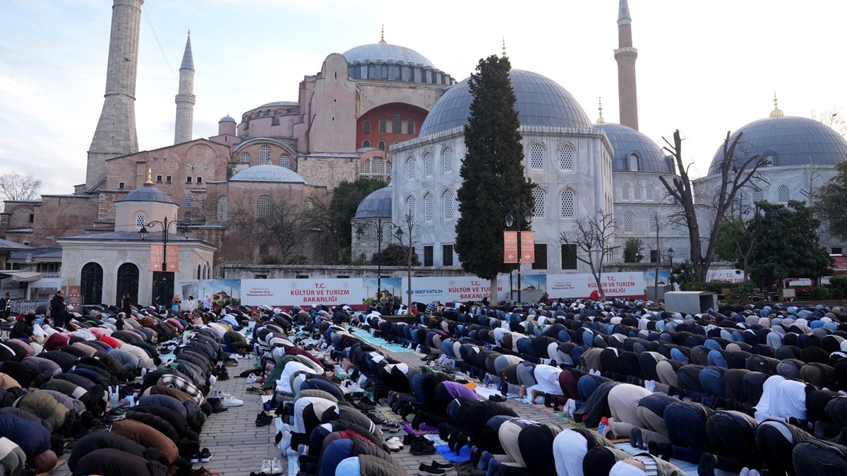 Ayasofya-i Kebir Camii ile Sultanahmet Camisi'nin içi bayram namazı vaktinden önce dolarken, bazıları namaz için Ayasofya Meydanı'nda saf tuttu.