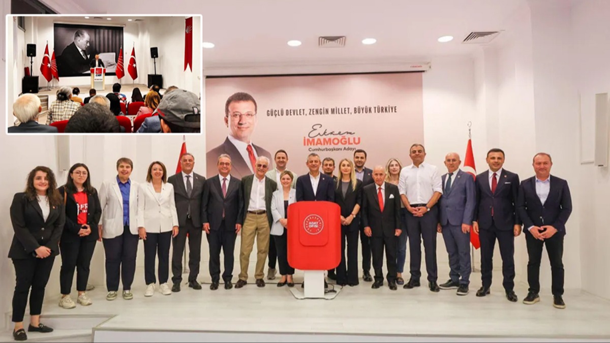 En dikkat çeken detay ise salonda yer alan Gazi Mustafa Kemal Atatürk'ün posteri kaldırılarak yerine İmamoğlu'nun fotoğrafının asılması oldu.