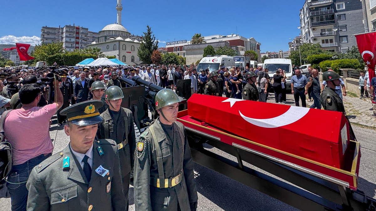 Şehit Maden'in Türk bayrağına sarılı naaşı, askeri cenaze aracıyla Gaziemir ilçesindeki 15 Temmuz Şehitler Camii'ne getirildi.