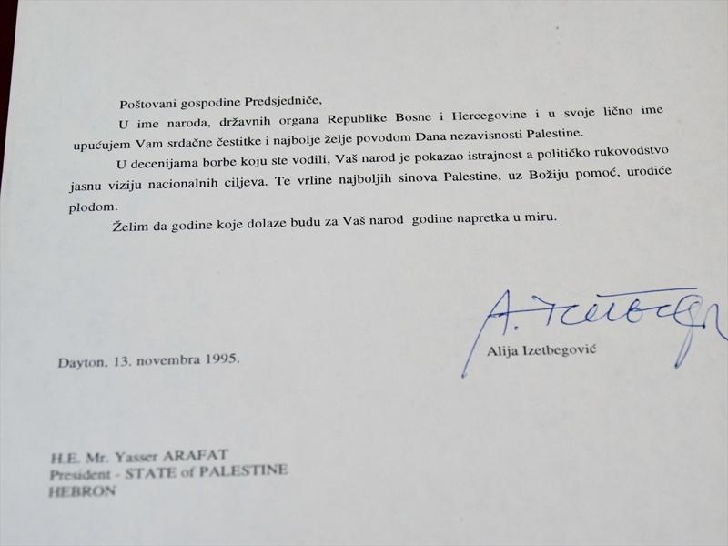 ABD'nin Dayton kentinden 13 Kasım 1995'te Arafat'a gönderdiği mektupta İzetbegoviç, Filistin Bağımsızlık Günü'nü tebrik ederek, "Yıllardır süren mücadelenizde halkınız azim gösterdi ve siyasi liderliğiniz, ulusal hedefler konusunda net bir vizyona sahip. Filistin'in en iyi evlatlarının bu erdemleri, Allah'ın yardımıyla meyve verecektir." ifadelerini kullandı.