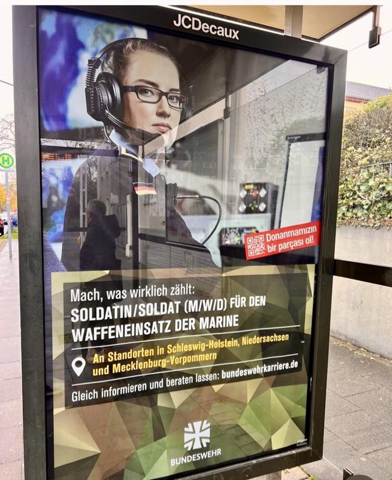 Alman Silahlı Kuvvetlerindeki (Bundeswehr) askeri personel sayısının mevcut 183 binden 2031'e kadar 203 bine çıkarılması hedefine ulaşmak için hazırlanan afişlerde Türkçe "Donanmamızın Bir Parçası Ol" ifadesiyle adayların başvuruda bulunması isteniyor.