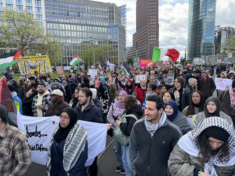 Potsdamer Platz'da İsrail'in Gazze'ye yönelik saldırılarını protesto etmek ve Filistin ile dayanışma göstermek amacıyla toplanan yaklaşık 2 bin kişi buradan Federal Meclis'e kadar yürüyüş gerçekleştirdi.