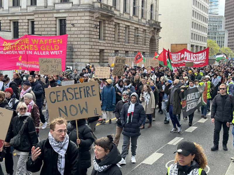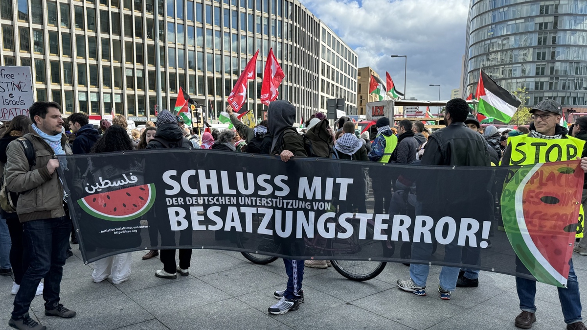 Yürüyüş esnasında, "Almanya finanse ediyor, İsrail bombalıyor", "Utanın utanın" ve "İsrail'e silaha yok" şeklinde sloganlar atıldı.