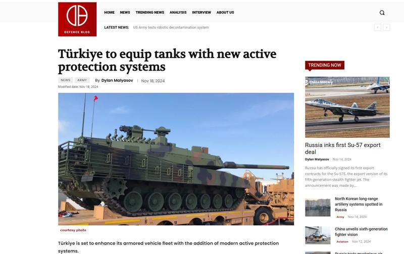 Polonya merkezli savunma haberleri sitesi Defence Blog, Türkiye'nin geliştirdiği aktif koruma sistemlerinin zırhlı araçlarda kullanılacak olmasını gündemine aldı. "Türkiye tankları yeni aktif koruma sistemleriyle donatacak" başlığıyla haber yayınlayan Polonya basını Defence Blog, Türkiye'nin zırhlı araç filosunu modern aktif koruma sistemleriyle güçlendirmeye hazırlandığını yazdı.