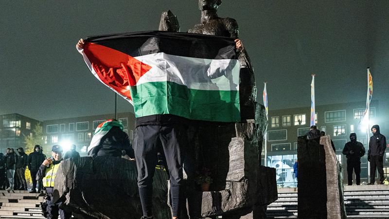 Göstericiler, müdahale öncesinde "Özgür Filistin", "Hollanda utan, ellerin kanlı", "İnsanlar birleşti" ve "Halklar birliktir, biz yenilmeyeceğiz" sloganları attı.