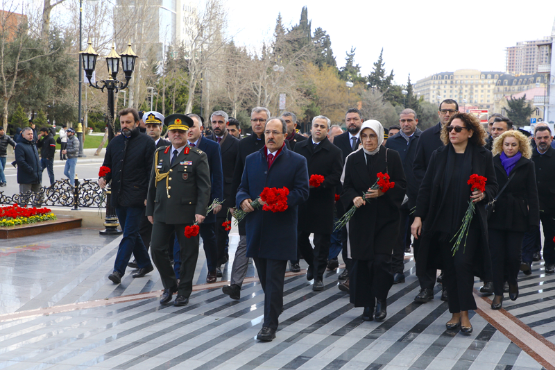 Türkiye'nin Bakü Büyükelçisi Cahit Bağcı, büyükelçilik çalışanları ile Bakü'deki Türk kurum ve kuruluşlarının temsilcileri de Ana Feryadı Anıtı'nı ziyaret ederek Hocalı Katliamı'nın kurbanlarını andı.