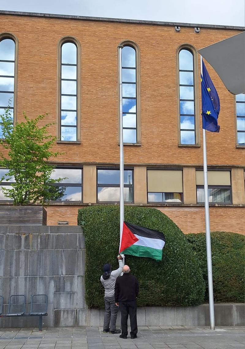 Belçika-Filistin Derneğinin çağrısıyla asılan bayrak, tepki çekmişti.