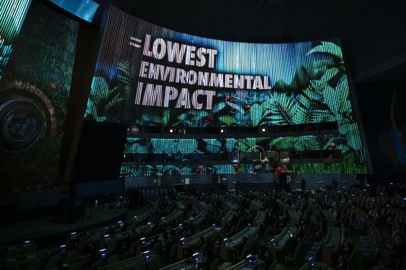 Üst düzey BM yetkilileri ile üye ülkelerin temsilcilerinin yer aldığı özel etkinlikte katılımcılar, Genel Kurul Salonu'nun ön duvarının tümünü kapsayan görsel haritalamayla sıfır atık çalışmaları konusunda bilgilendirildi.