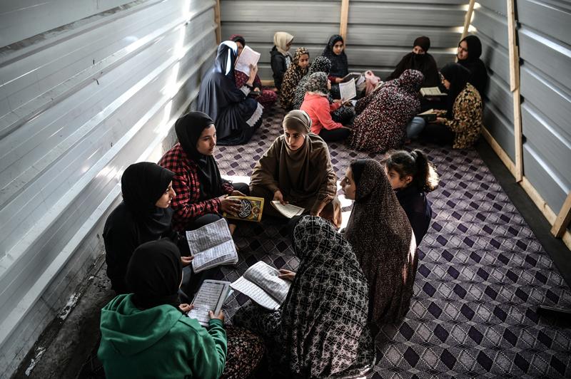 Binlerce yerinden edilen Filistinlinin sığındığı Kudüs İlköğretim Okulunda hafızlık ve tecvid öğretmenliği yapan İntisar el-Arabid, AA muhabirine, İsrail saldırıları nedeniyle 3 aydır eğitim-öğretimin durduğunu, ancak kendisinin gönüllü olarak gruplar halinde aldığı öğrencilere tecvit çalıştırıp, hafızlık yaptırdığını söyledi.