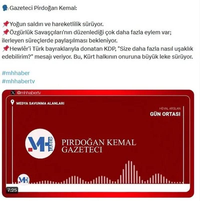 "Yoksa gerçekten de Başur elden gider. Şimdi yanına KDP'yi aldı. Ardından YNK'yi tehdit etmeye başladı. Onlar da böyle boyun eğerse bütün Başur gider. Zaten orada 100 civarında üsleri var, askerleri var. Hiç böyle dağlık alanlarda falan değil. Türkiye, bütün düzlüklerde bulunan şehirlerde. Erbil başta olmak hepsini eline geçirmiş durumda. Kimse bunları çıkaramaz. Çok dikkat etmek gerekiyor. Akıllı davranmak gerekiyor."