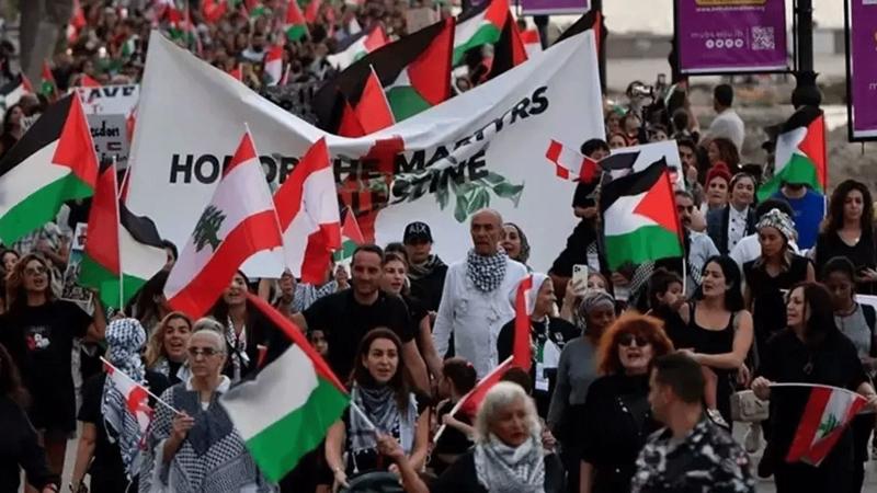 Filistin direnişini desteklediklerini ifade eden göstericiler, "Ne olursa olsun zafer kazanılmalı", "Ey şehit sen rahat uyu", "Mücadeleye devam edeceğiz" ve "Filistin damarlarımda akan kandır, infaz da etseler bunu unutmam" şeklinde sloganlar attı.