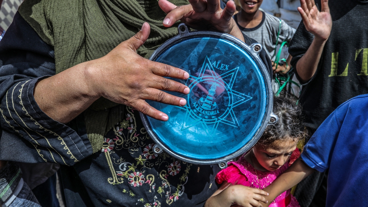 Gazze'deki Sosyal Kalkınma Bakanlığının organizasyonuyla açık alanda düzenlenen düğünde, müzik sesleriyle İsrail savaş uçaklarının sesleri birbirine karıştı.