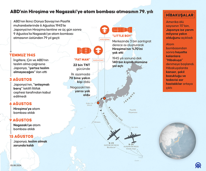 İkinci Dünya Savaşı'nda ABD 6 Ağustos 1945 sabahında 'Little Boy' adlı atom bombasını Japonya'nın Hiroşima kentine bıraktı. Hiroşima'nın yüzde 70'ini yok eden uranyum katkılı bomba, merkezinde 3 bin santigrat derece ısı oluşturdu. Bomba 1,5 kilometre çapındaki alanda her yeri yıktı ve ilk aşamada 80 bin, 1945'in sonuna doğru ise yaklaşık 200 bin insanın ölümüne neden oldu. Saldırı sonrasında da yıllar boyunca radyasyona bağlı hastalıklardan ölenler oldu.