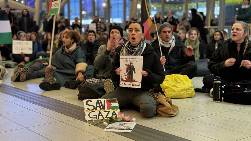 Hollanda'da merkez niteliğindeki Utrecht'te tren istasyonunda toplanan göstericiler, Filistin bayrakları taşıyarak "ateşkes" çağrısı yaptı.