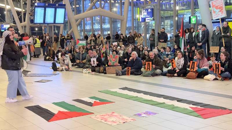 Ellerinde "Çocukları ve hastaneleri bombalamayı durdur", "Refah'tan ellerini çek", "İşgali durdur" ve "Seni soykırımla yargılıyoruz" yazılı dövizler taşıyan göstericiler, "Nehirden denize kadar, Filistin özgür olacak", "Şimdi ateşkes" ve "Hollanda utanç verici, ellerin kanlı" sloganı attı.