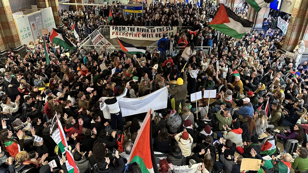 Başkent Amsterdam'daki merkezi tren istasyonunda yerel saatle 18:00'de toplanan göstericiler, "Özgür Filistin" ve "Nehirden denize özgür Filistin" sloganları attı.