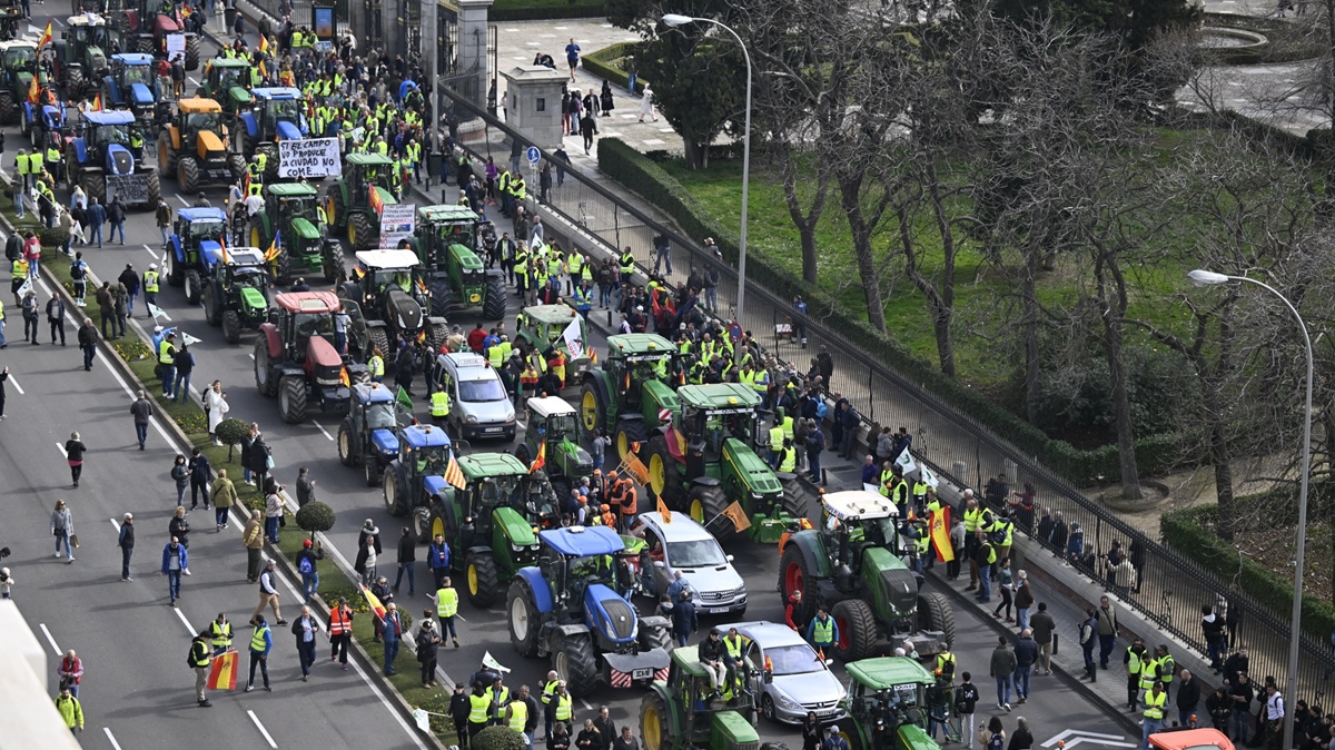 Gösteri için Madrid'e gelen çiftçiler ile traktörleriyle meydana ulaşan çiftçiler, Tarım, Gıda ve Balıkçılık Bakanlığı binasına doğru yürümek istedi.