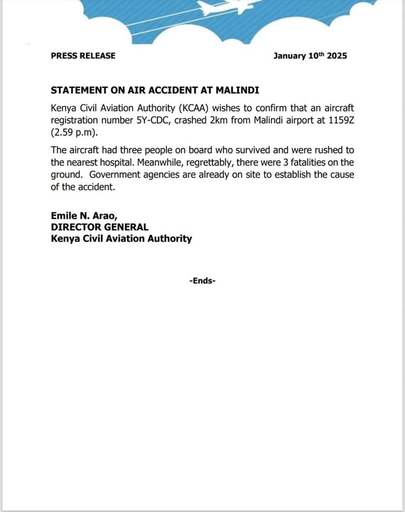 Kenya Sivil Havacılık Otoritesi olayla ilgili soruşturma başlatıldığını ifade ederek, "Ne yazık ki yerde üç kişi hayatını kaybetti. Devlet kurumları kazanın nedenini tespit etmek üzere halihazırda olay yerinde bulunmaktadır" dedi.