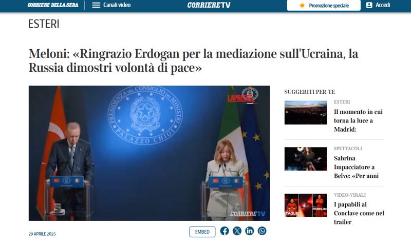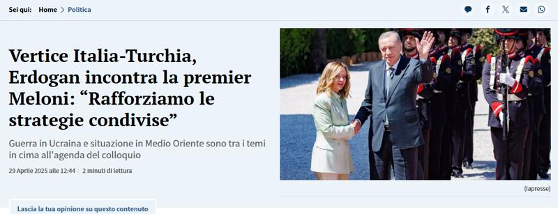 La Stampa gazetesinin "Meloni, Erdoğan ile ittifakını güçlendiriyor ve Türkiye'nin AB üyeliğini destekliyor" başlığıyla verdiği haberde, reelpolitik durumun yani Ukrayna Savaşı'nın, Ankara'nın rolünün İtalya açısından kritikliğini anlamak için hayati önem taşıdığı vurgulandı.