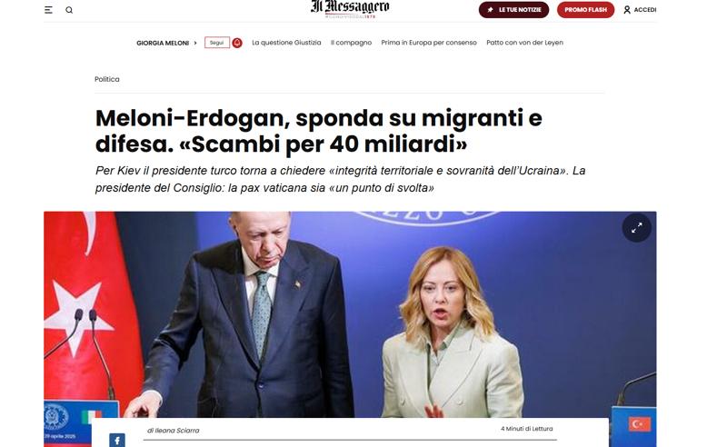 Il Messaggero gazetesi, Cumhurbaşkanı Erdoğan ve İtalya Başbakanı Meloni'nin görüşmesini, manşetten "Meloni-Erdoğan ittifakı: 40 milyar dolar ihracat" başlığıyla okuyucularına duyurdu.