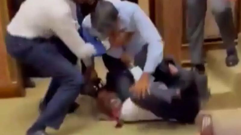 Kavga eden milletvekillerinin, birbirlerini tekmelediği ve yere düştüğü anların kameralara yansıdığı görüldü.