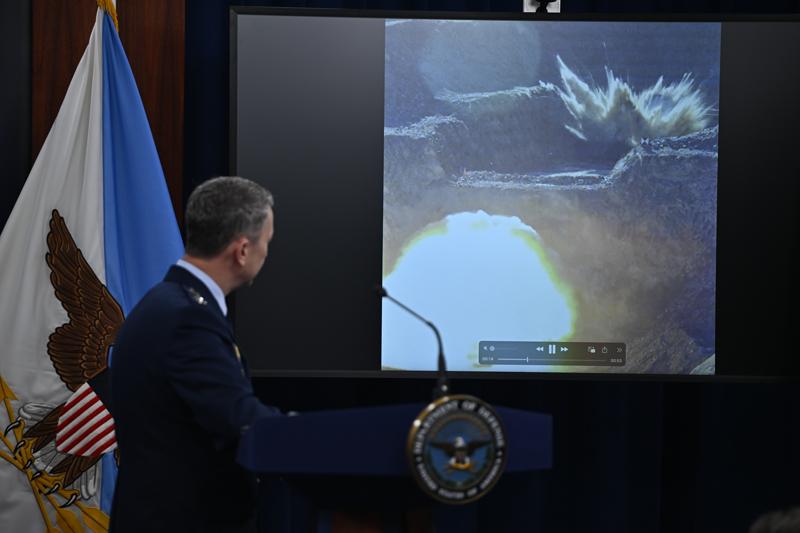 Genelkurmay Başkanı Caine, basın toplantısında nükleer tesislere düzenlenen saldırılara ilişkin görüntüler izletti.