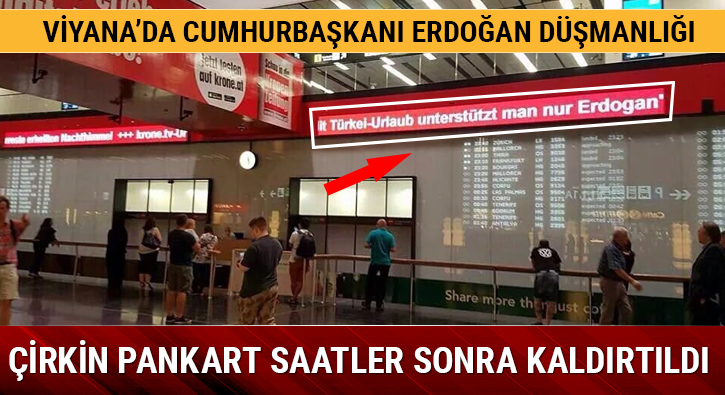 FETÖ darbesini protesto eden Türklerin evlerine ve balkonlarına bayrak asmasının yasaklandığı Avusturya’da yeni bir skandala imza atıldı. Viyana Havalimanı’na gidenler ‘Türkiye tatili Erdoğan’ı desteklemekten başka bir şey değil’ yazısıyla karşılaştı. Bu gelişme, Avrupa ülkelerinin demokrasiyi savunan darbe karşıtı Türklere yönelik yeni bir baskısı olarak yorumlandı. Daha sonra Dışişleri Bakanlığı bu yazıyı kaldırttı.