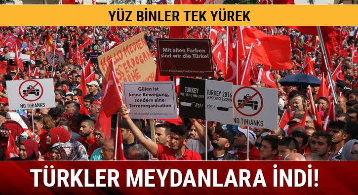 FETÖ’nün 15 Temmuz’da Türkiye’de düzenlediği darbe girişimi Almanya’nın Köln kentinde Avrupa’nın dört bir yanından gelen onbinlerce gurbetçi tarafından protesto edildi. ‘Darbeye Karşı Demokrasi Mitingi’ adıyla Avrupalı Türk Demokratlar Birliği’nin (UETD) düzenlediği gösteri Alman siyasilerin engelleri ve güvenlikle ilgili korkutmalarına rağmen oldukça coşkulu geçti. Fakat mitinge ‘telekonferans yasağı’ gölgesi düştü: Alman Anayasa Mahkemesi Cumhurbaşkanı Recep Tayyip Erdoğan’ın göstericilere meydanda kurulacak dev ekrandan seslenmesinin ‘güvenlik gerekçesiyle’ önüne geçti. Oysa Köln’de 2011 senesinde bir festivale PKK’lı terörist Murat Karayılan görüntülü olarak katılmıştı.