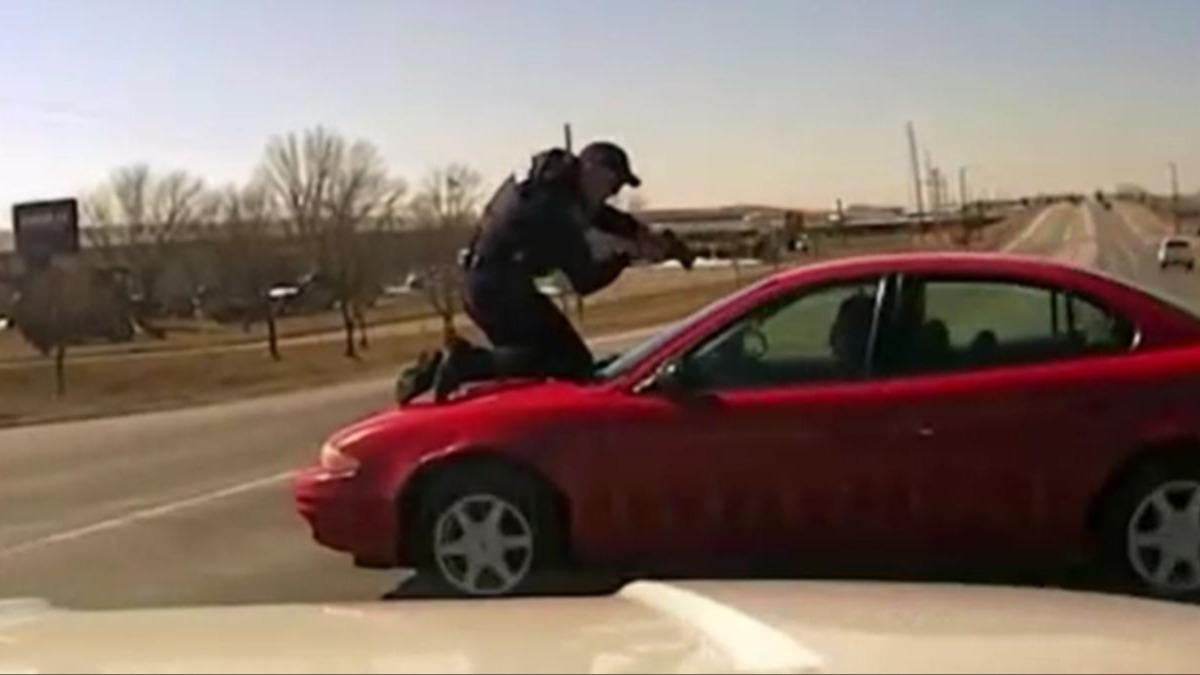 Kısa süre önce halkla paylaşılan videoda, bir polisin zanlının kaçmasını engellemek için arabanın kaputuna tutunduğu görüldü.
