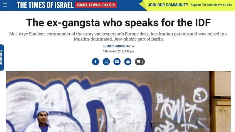 İSRAİL ORDUSUNUN YENİ TÜRKÇE SÖZCÜSÜ "ESKİ BİR GANGSTER"İsrail'in en büyük haber sitelerinden The Times of Israil, ordunun Türkçe sözcülüğünü yapmaya başlayan Shalicar'ın eski bir çete üyesi olduğunu, "İsrail ordusu adına konuşan eski gangster" başlığıyla okuyucularına duyurmuştu.