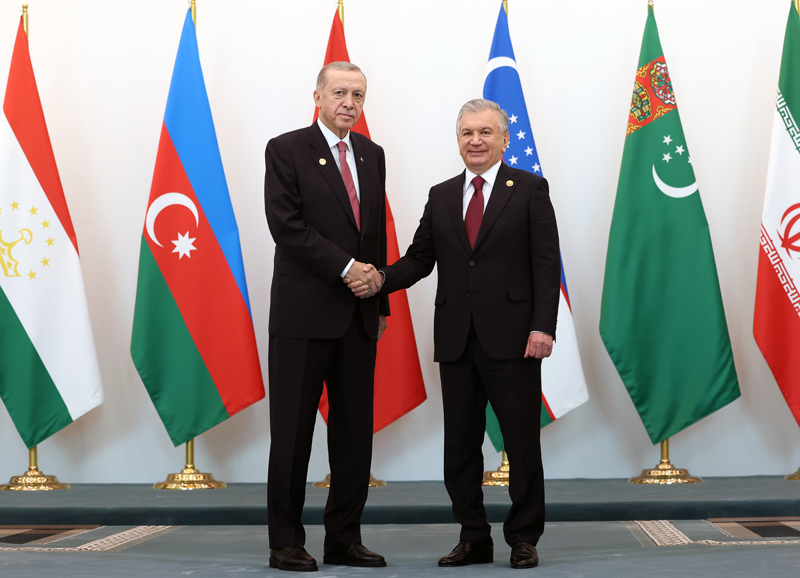 Cumhurbaşkanı Recep Tayyip Erdoğan, zirvenin düzenlendiği Taşkent Uluslararası İş ve Kongre Merkezi'ne gelişte Mirziyoyev tarafından karşılandı.