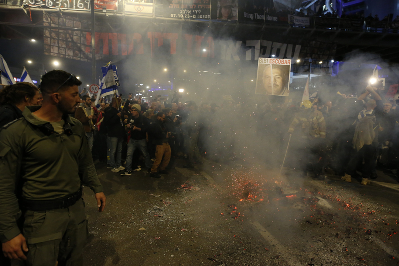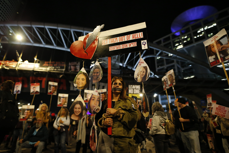 Hükümet karşıtı protestolara eş zamanlı olarak Menachem Begin Caddesi üzerindeki Savunma Bakanlığının önünde de İsrailli esirlerin salıverilmesi çağrılarıyla başka bir gösteri düzenlendi.