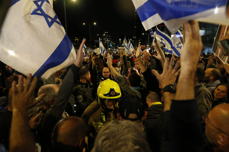 Gösterilerin odağı başkent Tel Aviv'de, Netanyahu hükümetinin yargı düzenlemelerine karşı protestolarda sembolleşen, polisin demir bariyerlerle kapattığı Kaplan Caddesi'nde binlerce protestocu akşam saatlerinde bir araya geldi.