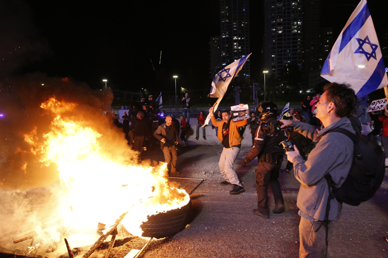 Bakanlığın önünde polisin müdahale ettiği eylemciler yürüyüşe devam ederek, Tel Aviv'in ana arteri Ayalon Otoyolu'nda kuzey istikametteki trafiği kapattı.