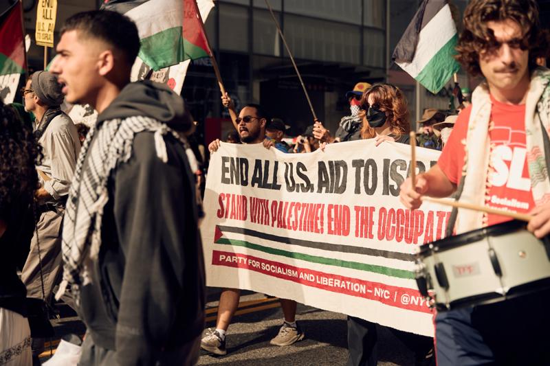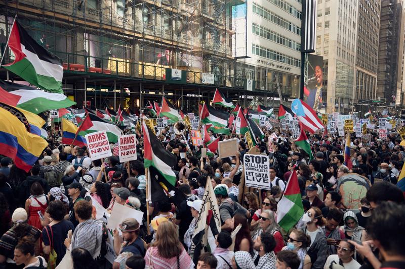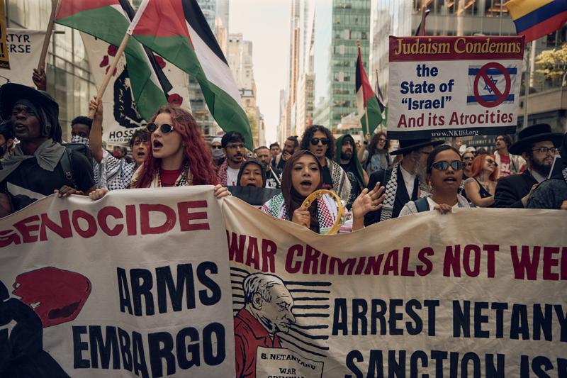 Filistin bayrakları ve İsrail'in Gazze'de işlediği soykırımı protesto eden pankartlar taşıyan göstericiler, Netanyahu'nun BM Genel Kurul toplantıları için New York'a gelmesini ve Gazze'de devam eden soykırımı kınadı.