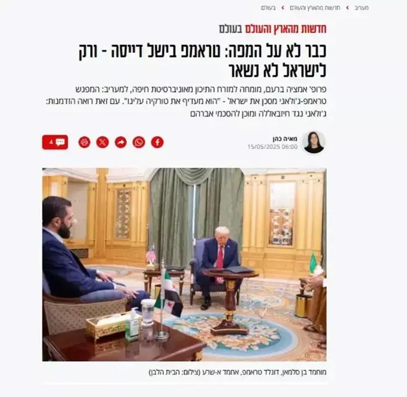 Hayfa Üniversitesi Ortadoğu uzmanı Prof. Amaziah Baram, "Trump, İsrail Başbakanı'nın tutumuna aykırı olarak Şara ile görüştü. Kendi ağzıyla İsrail'in değil Türkiye'nin görüşünü tercih ettiğini söyledi. Bu sadece Suriye meselesi ile ilgili değil, Türkiye'nin İsrail'in önünde tutulması çok büyük bir sorun" ifadelerini kullandı.
