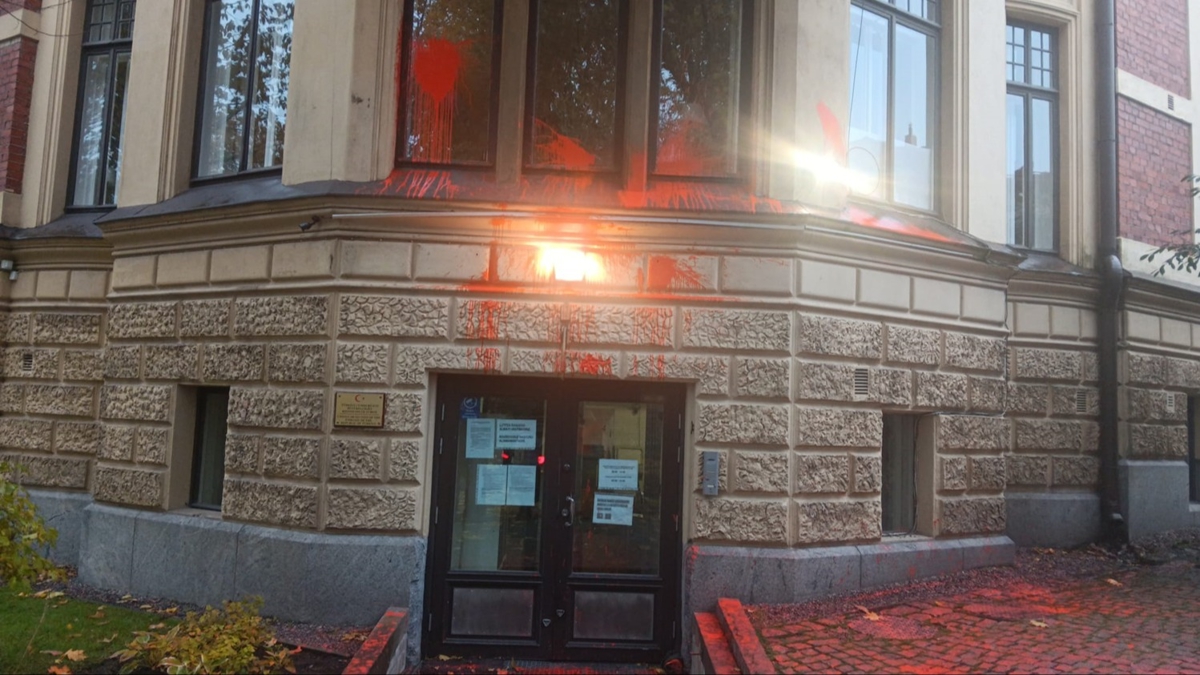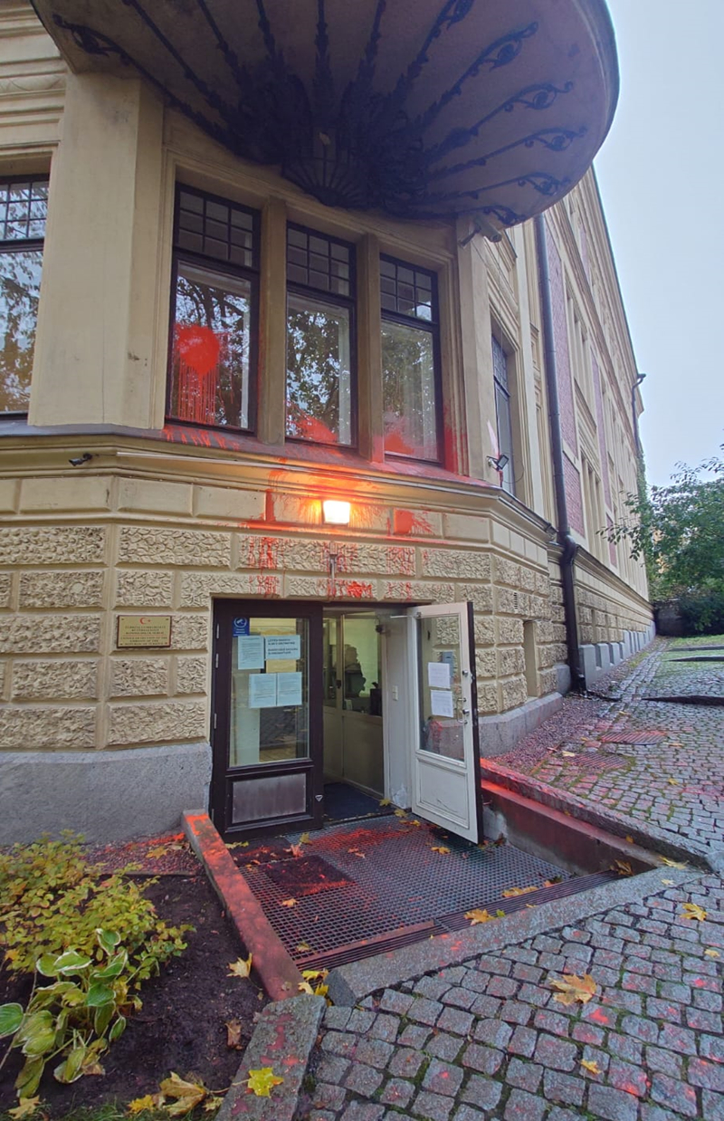 Finlandiya'da, Türkiye'nin Helsinki Büyükelçiliğinin girişine bugün boyalı ve sis bombalı saldırı düzenlenmişti.