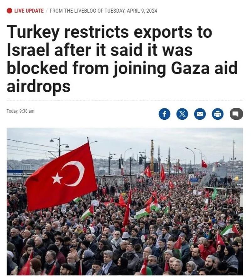 Times od Israel, "Türkiye, Gazze'ye hava yardımlarına katılmasının engellendiğini söyledikten hemen sonra İsrail'e ihracatı kısıtladı" başlıklı haberinde, "Türk Ticaret Bakanlığı, Gazze'de ateşkes ilan edilene kadar Türkiye'nin İsrail'e 54 farklı kategorideki ürünlerin ihracatına derhal geçerli olmak üzere kısıtlamalar uygulayacağını söyledi." İfadelerine yer verdi.