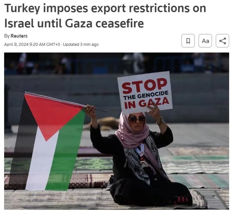 Ticaret Bakanlığı'ndan son dakika olarak gelen, "Türkiye, 9 Nisan 2024'ten itibaren bazı ürünlerin İsrail'e ihracatını kısıtlama kararı almıştır. Kararın gerekleri Bakanlıkça derhal yürütülecektir." açıklaması ise bir kez daha Türkiye'nin kararlılığının altını çizdi. Bloomberg haberinde, "Ticaret Bakanlığı'nın İsrail'e yönelik kısıtlama kararı, inşaat demirinden yassı çeliğe, mermerden seramiğe kadar 54 ürün grubunu kapsıyor." ifadelerine yer verdi.