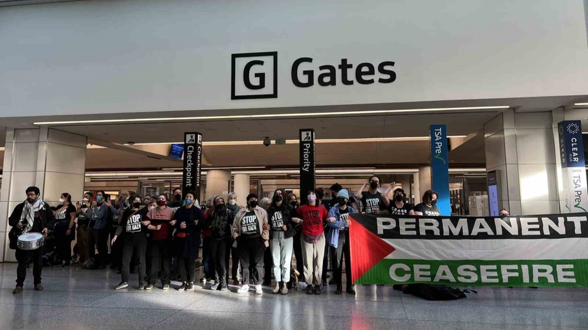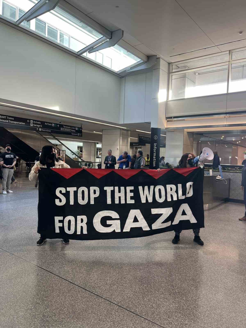 İsrail'in Gazze'ye yönelik saldırıları devam ederken, Gazze'de ateşkes talep eden ve ABD'nin İsrail'e yönelik askeri yardımlarına son vermesini isteyen bir grup San Francisco Uluslararası Havaalanı'nda protesto gösterisi düzenledi.