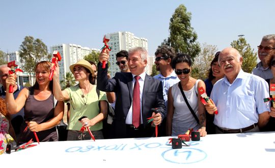 Konuşmalardan sonra Karşıyaka Belediye Başkanı Cevat Durak sanatçılarla birlikte çekiçle mermere vurarak çalışmaları başlattı.