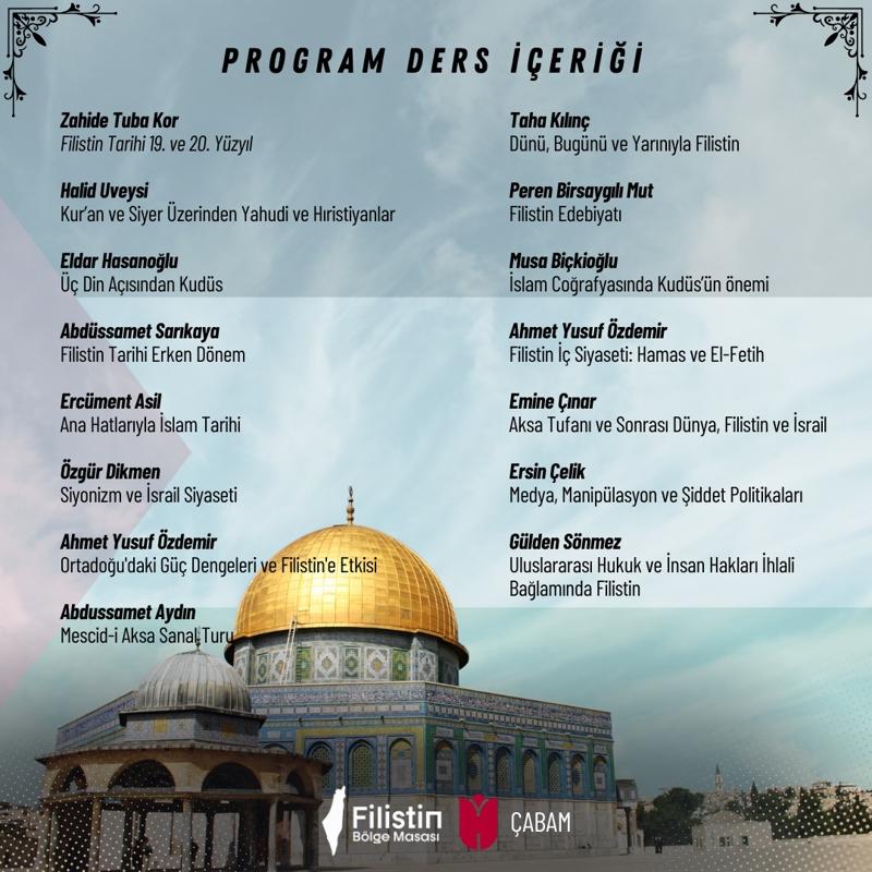 Katılımcılar Filistin'i tarihî siyasi, hukuki ve kültürel açıdan detaylı bir şekilde tanıma imkanı bulacak. Ayrıca güncel durumda her yönüyle ele alınacak. Ayrıca düzenlenen seminerler de dersleri destekleyici içeriğe sahip olacak. Dersler 18 Şubat'ta başlayıp 7 Nisan'da tamamlanacak. İbn Haldun Üniversitesi Süleymaniye Yerleşkesi'nde bulunan Darülkurra Medresesi'nde yüz yüze yapılacak ve Pazar günleri 10:00 ile 15:30 arasında yapılacak. Ders ve etkinliklere katılım durumu, ödevler ve final sınavı puanlandırılacak, dereceye girenlere çeşitli hediyeler verilecek.