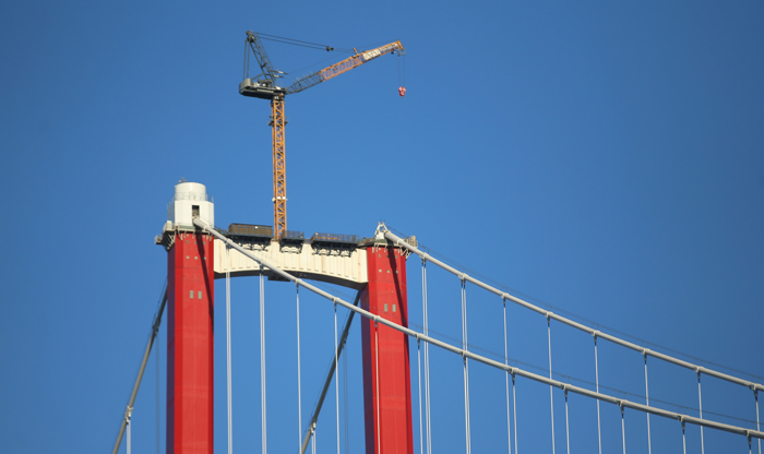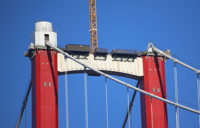 Çanakkale Boğazı'nın Lapseki ve Gelibolu ilçeleri arasına inşa edilen 1915 Çanakkale Köprüsü'nün kulelerine yerleştirilecek top mermisi figürleri için kaidelerin yerlerine kurulması için çalışma başlatıldı.