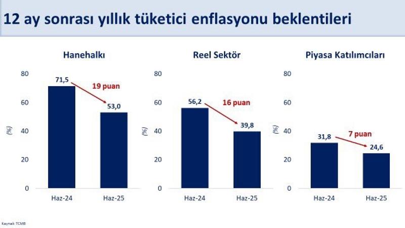 Haziranda enflasyon beklentilerin tüm kesimlerde gerilediğini dile getiren Hazine ve Maliye Bakanı Mehmet Şimşek, sosyal medyadan yaptığı açıklamada, "Hanehalkının 12 ay sonrası enflasyon beklentisi bir önceki aya göre 7 puan, geçen yılın aynı dönemine göre 19 puan azaldı. Reel sektör ve piyasa katılımcılarının enflasyon beklentilerinde de düşüş devam etti. Hanehalkı ile piyasa beklentileri arasındaki farkın yaklaşık 6 yılın en düşük seviyesine inmesi, enflasyon ataletinin kırılması açısından önemli bir gelişmedir. Beklentilerdeki bu iyileşme uyguladığımız programın etkili ve kararlı adımlarla hedefine doğru ilerlediğini gösteriyor. Jeopolitik gerginliklerin azalmasıyla petrol fiyatları geriliyor. Enflasyondaki düşüşün devam etmesiyle yurtiçi finansal koşullar reel sektör için daha destekleyici hale gelecektir" dedi.