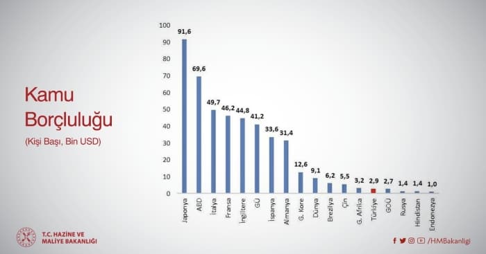 Kişi başı kamu borçluluğunda dünya ortalaması 9 bin 108 dolar, gelişmiş ülkeler ortalaması 41 bin 178 dolar, gelişmekte olan ülkeler ortalaması 2 bin 726 dolar oldu. Türkiye'de kişi başı kamu borçluluğu rakamı ise 2 bin 854 dolar olarak belirlendi.