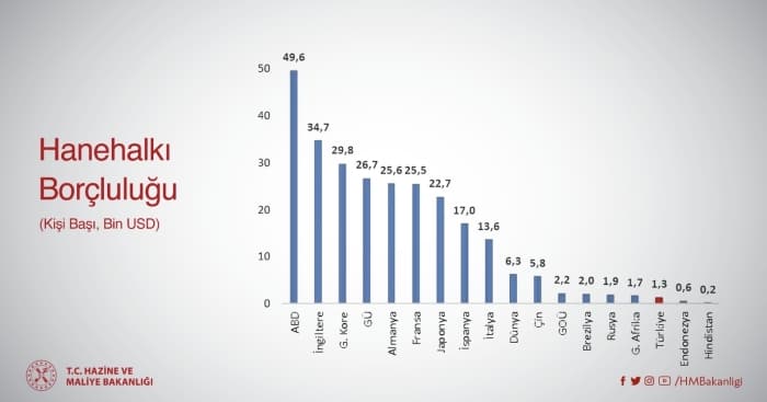 Berat Albayrak'ın paylaşımında, Türkiye ve dünya ülkelerinin hane halkı ve kamu borçluluğu rakamlarına da yer verildi.