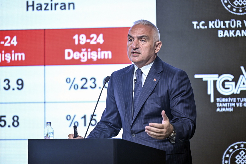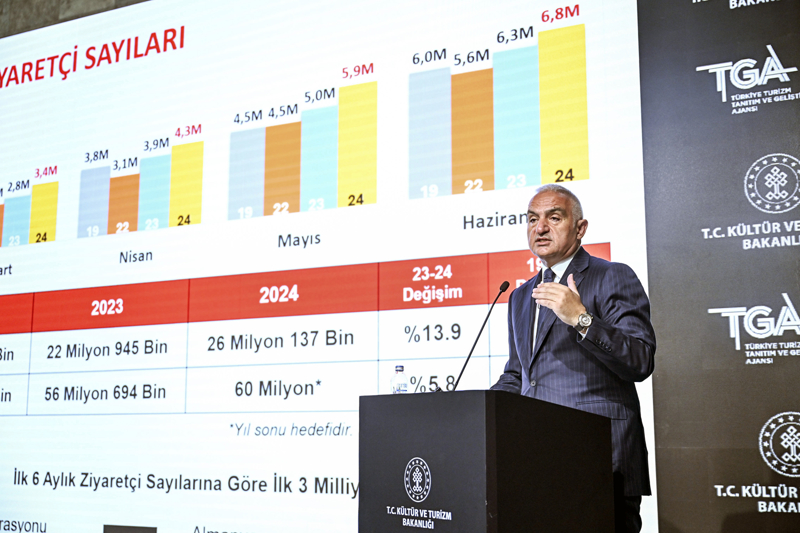 Kültür ve Turizm Bakanı Mehmet Nuri Ersoy, Atatürk Kültür Merkezi'nde düzenlenen toplantı ile 2024 yılı ilk 6 aylık turizm verilerini açıkladı. Bakan Ersoy, yılın ilk 6 ayında 23,7 milyar dolarlık rekor turizm geliri elde edildiğini duyurdu. Bakan Ersoy, turizm gelirlerindeki rekorların sonraki çeyreklerde de görüleceğinin altını çizerek, "Yıl sonu hedefimiz olan 60 milyar doları aşabiliriz" dedi.